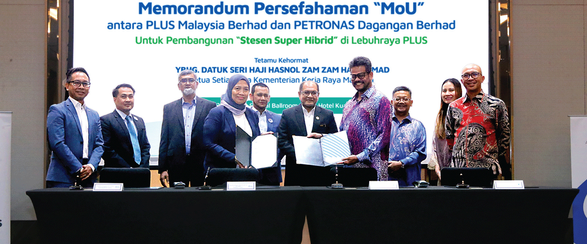 Datuk Nik Airina Nik Jaffar, Managing Director of PLUS Malaysia Berhad (front, left), Azrul Osman Rani (front, right), exchange MOU documents to establish Cooperation to develop the first Super Hybrid Station on the highway.